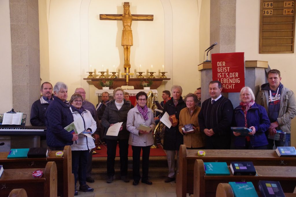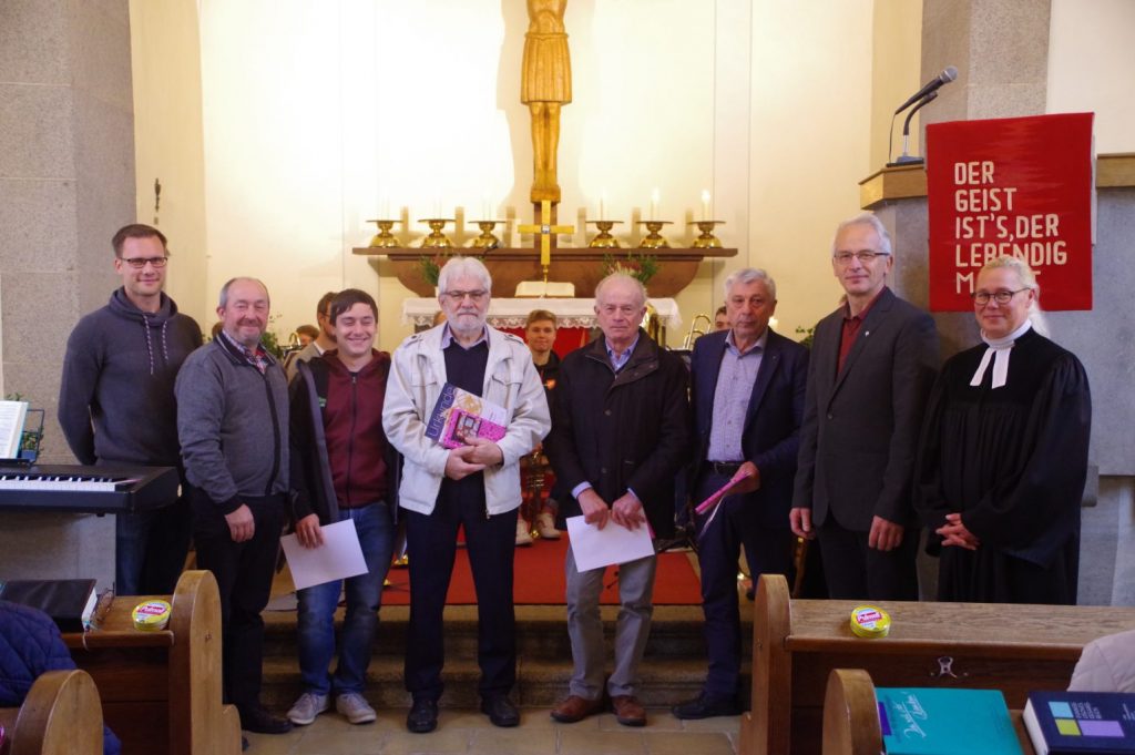 Auch einige Bläser wurden vom Verband ev. Posaunenchöre mit Urkunden und Anstecknadeln bedacht: Johann Popp (60 Jahre), Wolfgang Schneider und Karl Mandel (50 Jahre), Johann Schmidt, Otto Weigand, Christine Kern (40 Jahre), Rainer Düll, Martina Schmidt und Michael Weigand (10-30 Jahre).