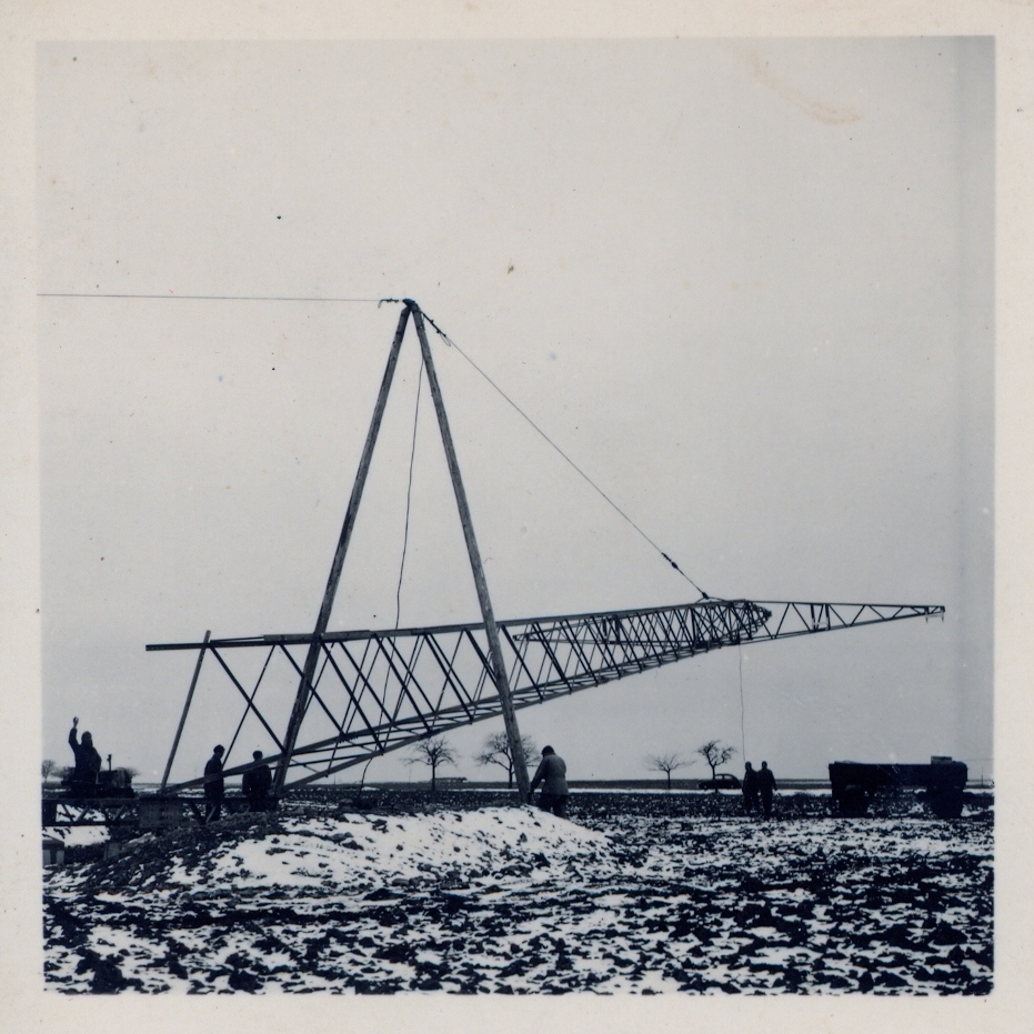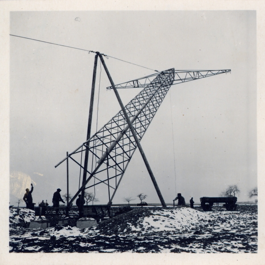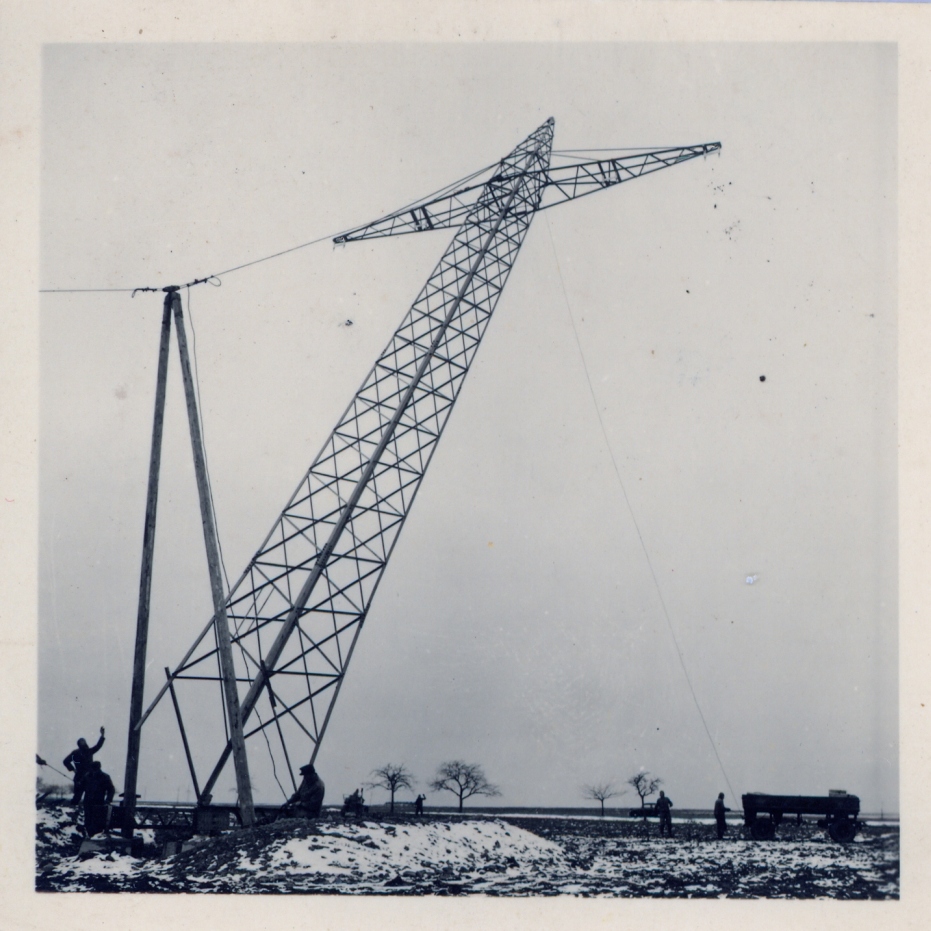 Bau der Stromtrasse auf Hellmitzheimer Gemarkung. Diese Überlandleitung wurde für die Elektrifizierung der Bahnstrecke Nürnberg – Würzburg in den 1950er Jahren errichtet.