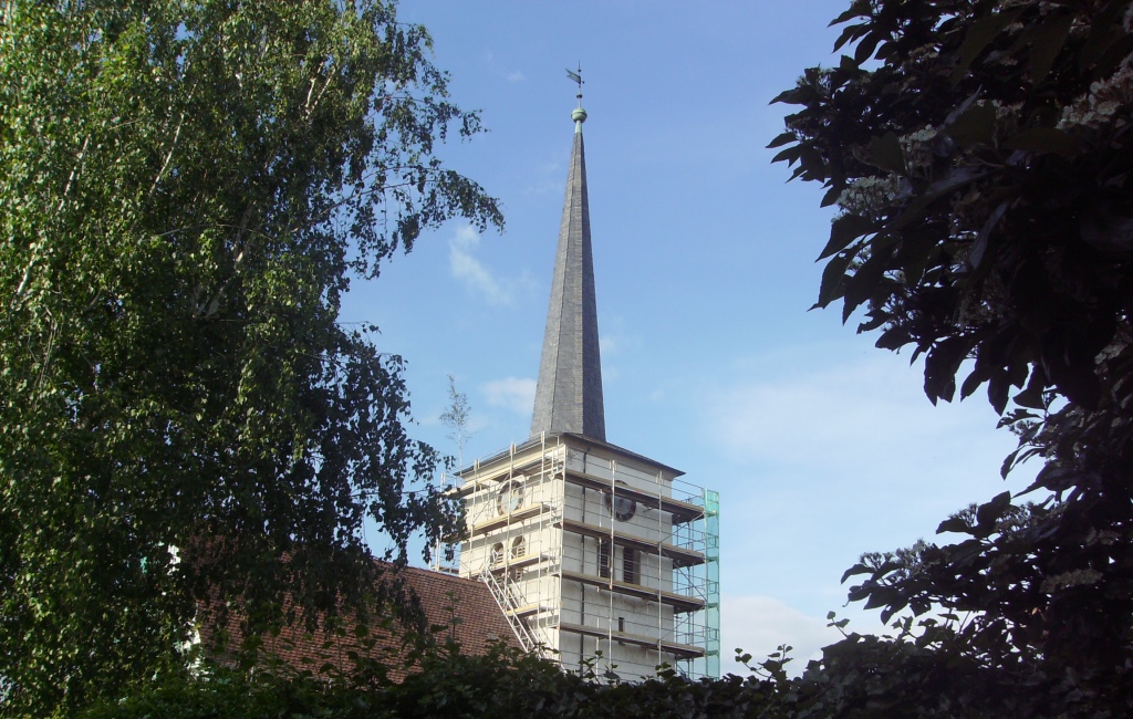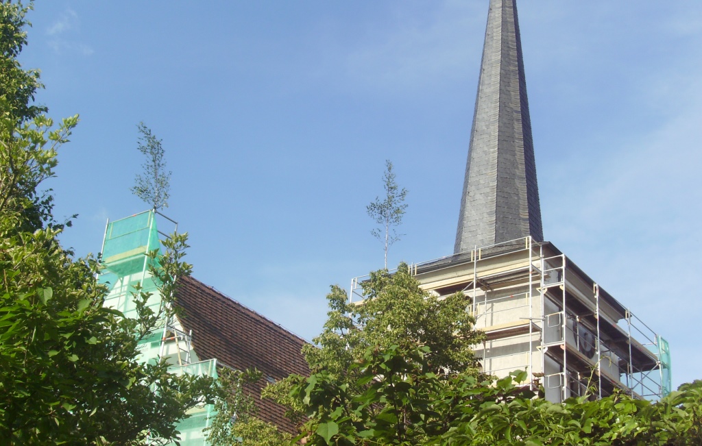 Am damaligen Pfingstwochenende 2009 ergab sich bedingt durch diese Renovierungsarbeiten die Gelegenheit, vom Gerüst am Kirchturm einen Rundumblick über die Dächer von Hellmitzheim zu wagen. Kurz vor dem „Fototermin“ ging damals ein heftiger Gewitterschauer nieder.